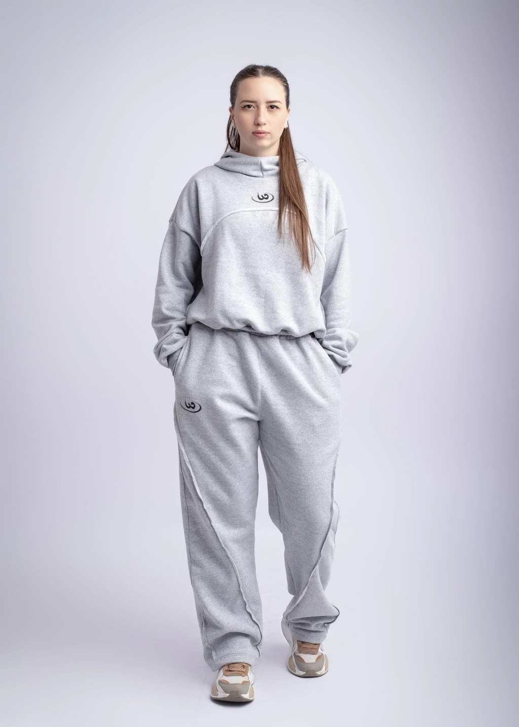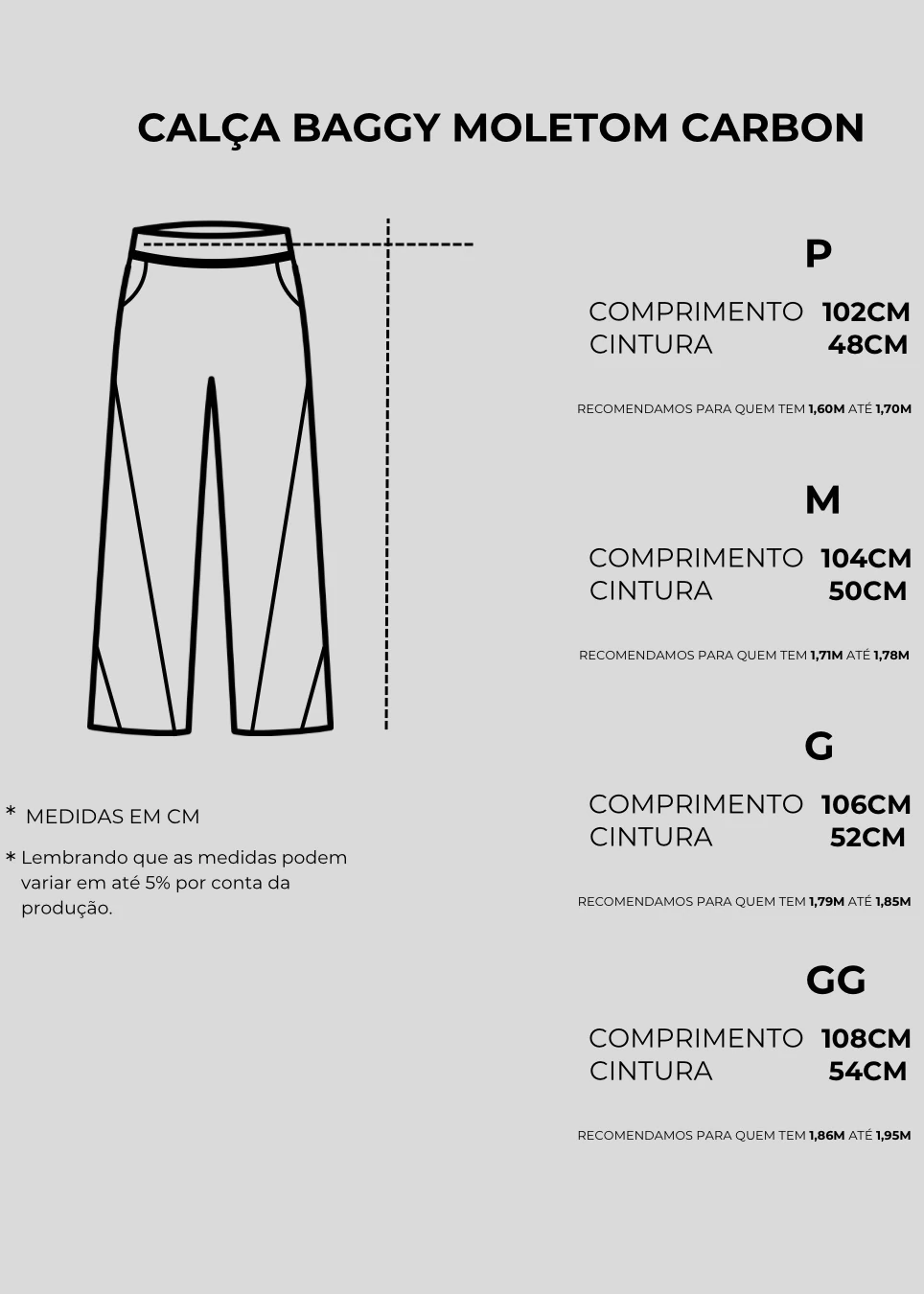 Na parte superior, o moletom apresenta modelagem boxy, ombros levemente caídos e recorte frontal que adiciona originalidade à silhueta. A calça baggy traz volume na medida certa, com cós elástico para ajuste confortável.